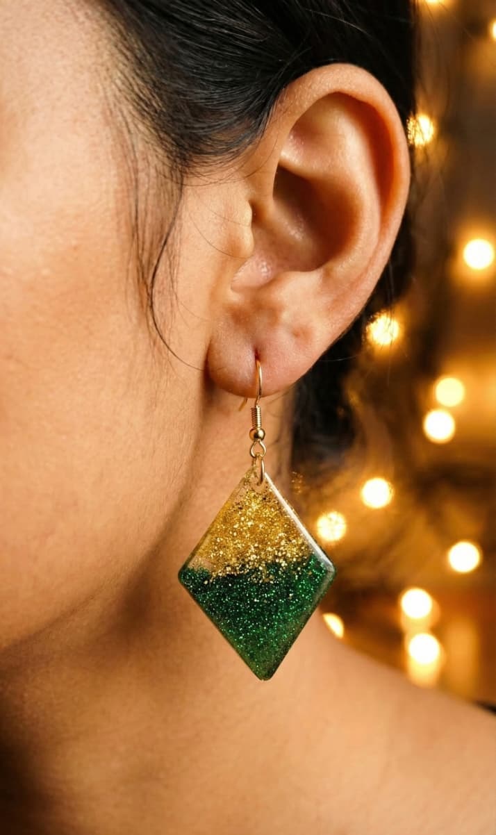 Handcrafted Resin Diamond Shape Dangle Earrings, Green and Gold Glitter, Hook Style