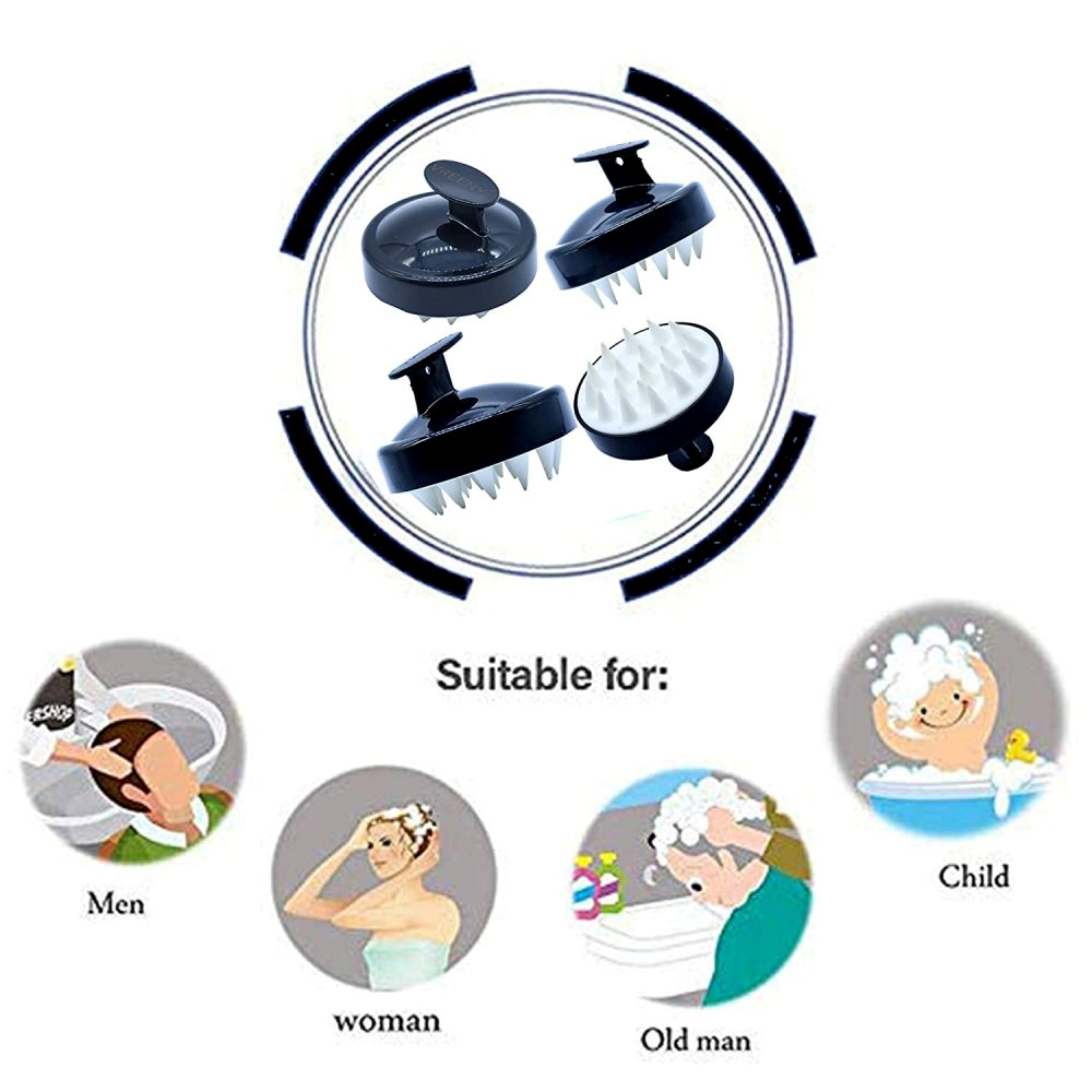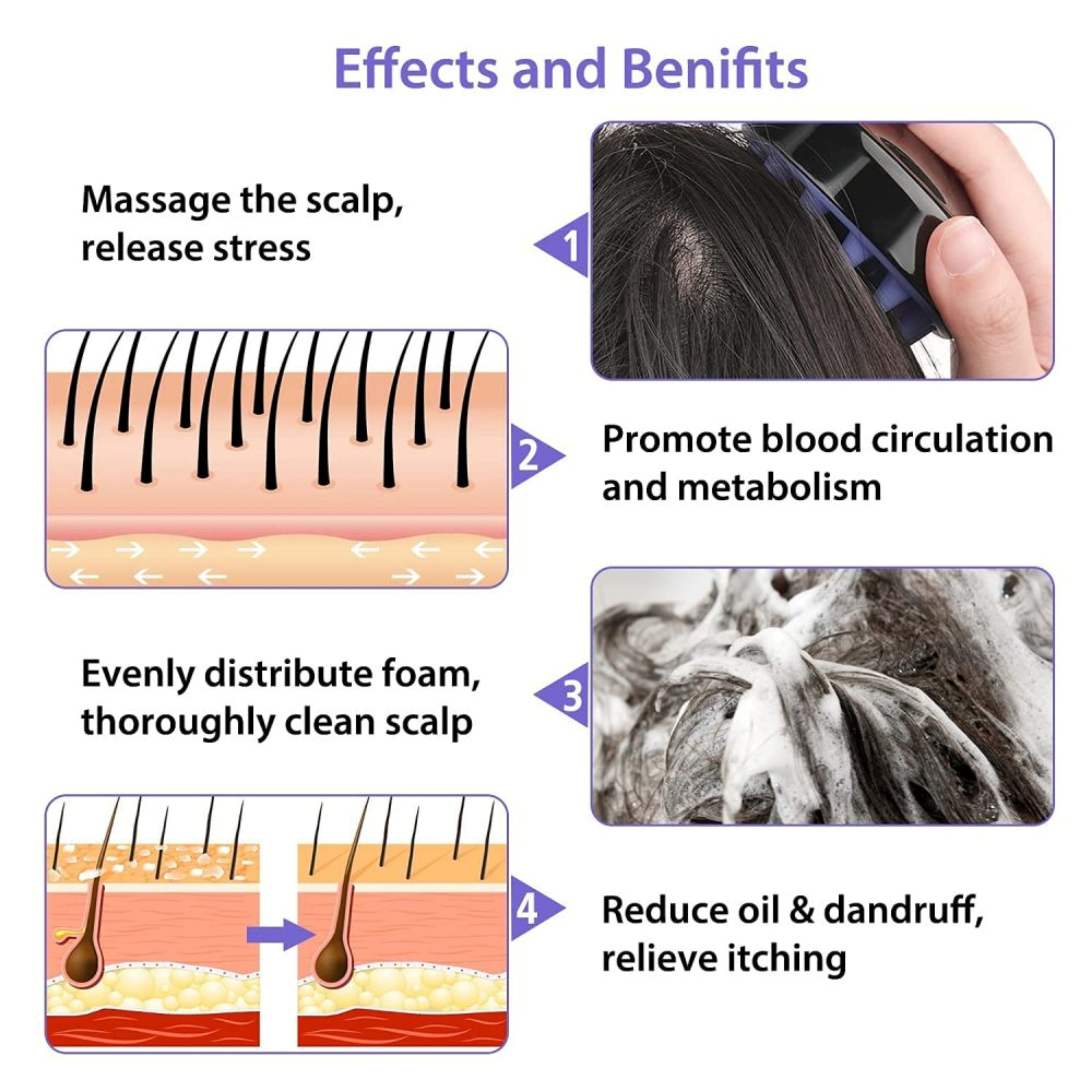 · ✔️ Relaxes Muscles & Reduces Stress: Massaging with the Scalp Massager stimulates nerve endings, triggering the release of endorphins (the body's natural feel-good hormones). This calming and soothing sensation not only promotes better scalp health and hair growth but also helps reduce stress and tension.