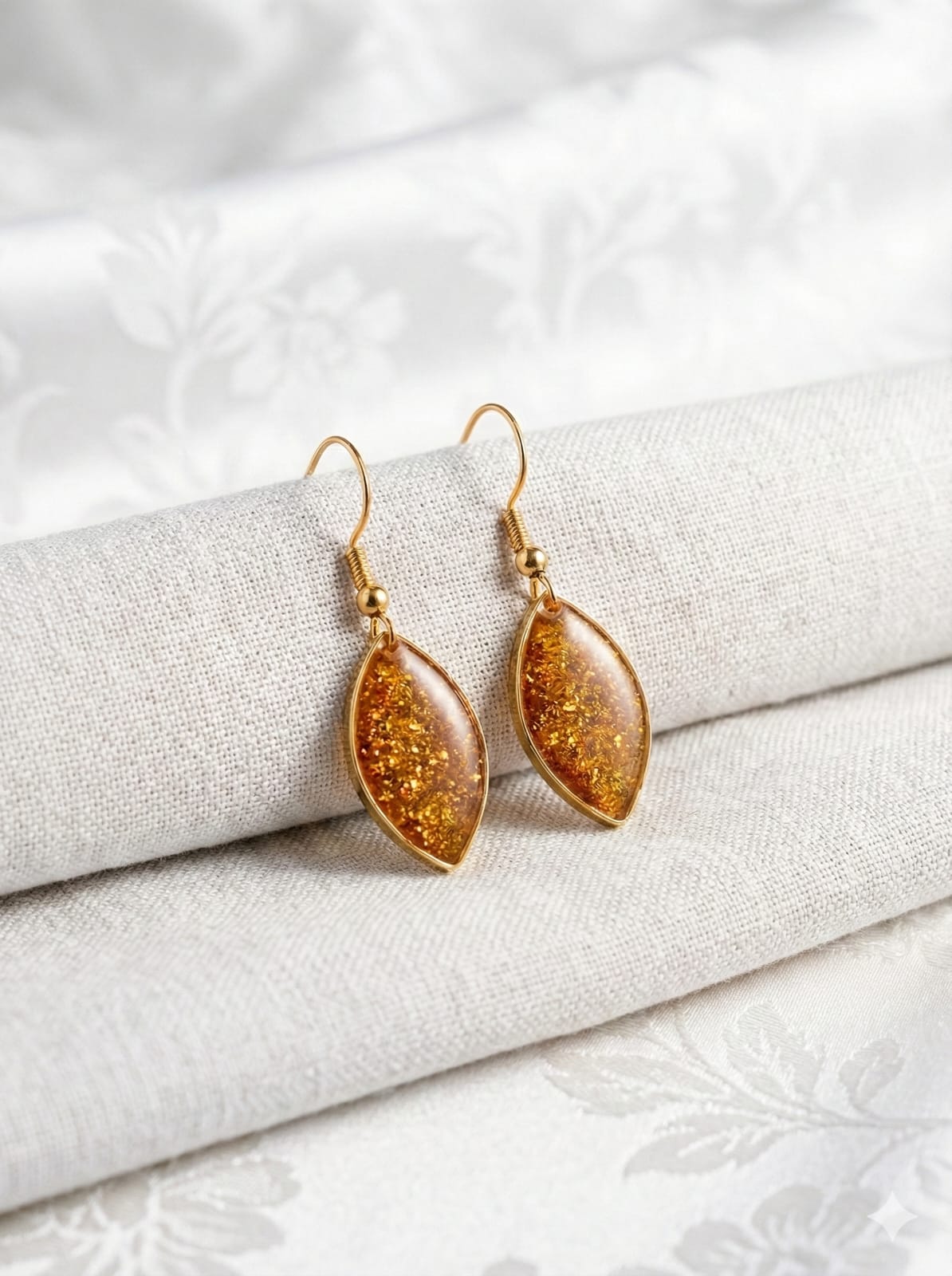 Gold Glitter Resin Marquise Drop Earrings, Leaf Shape, Dangle Hook Style