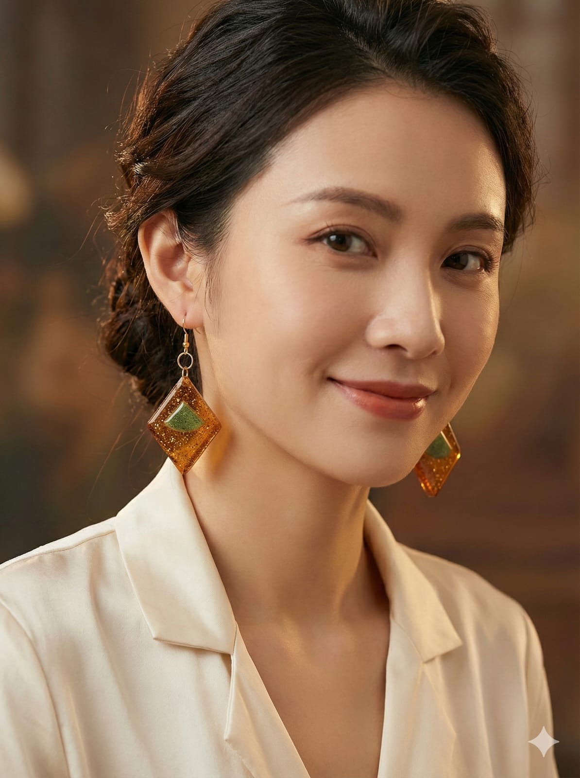 Diamond Shape Resin Drop Earrings, Gold Glitter with Green Accent, Dangle Hook Style