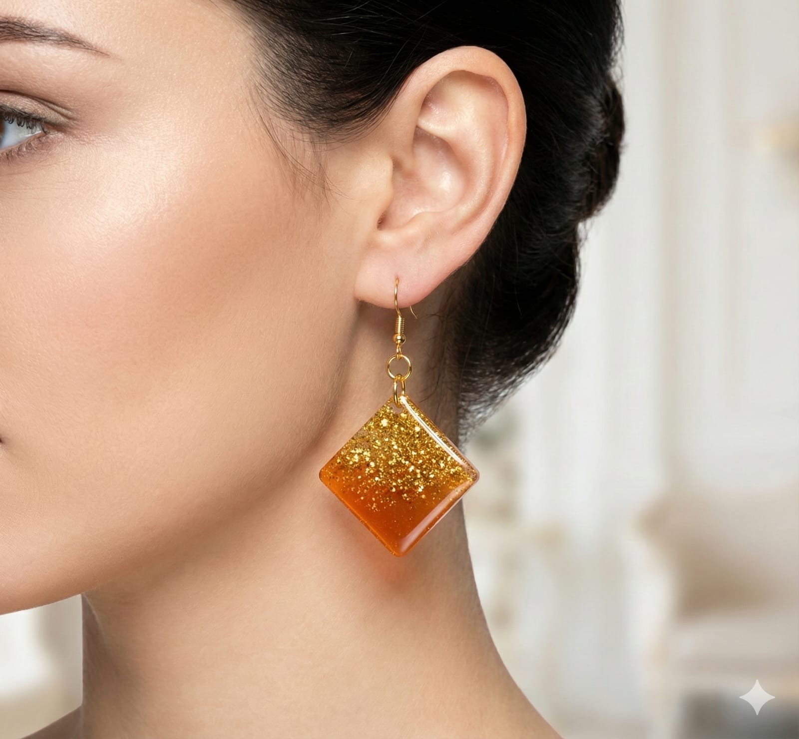 Diamond Shape Resin Dangle Earrings, Orange and Gold Glitter, Hook Style